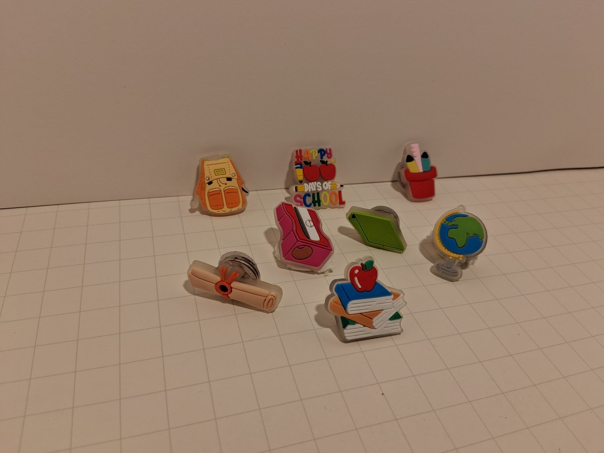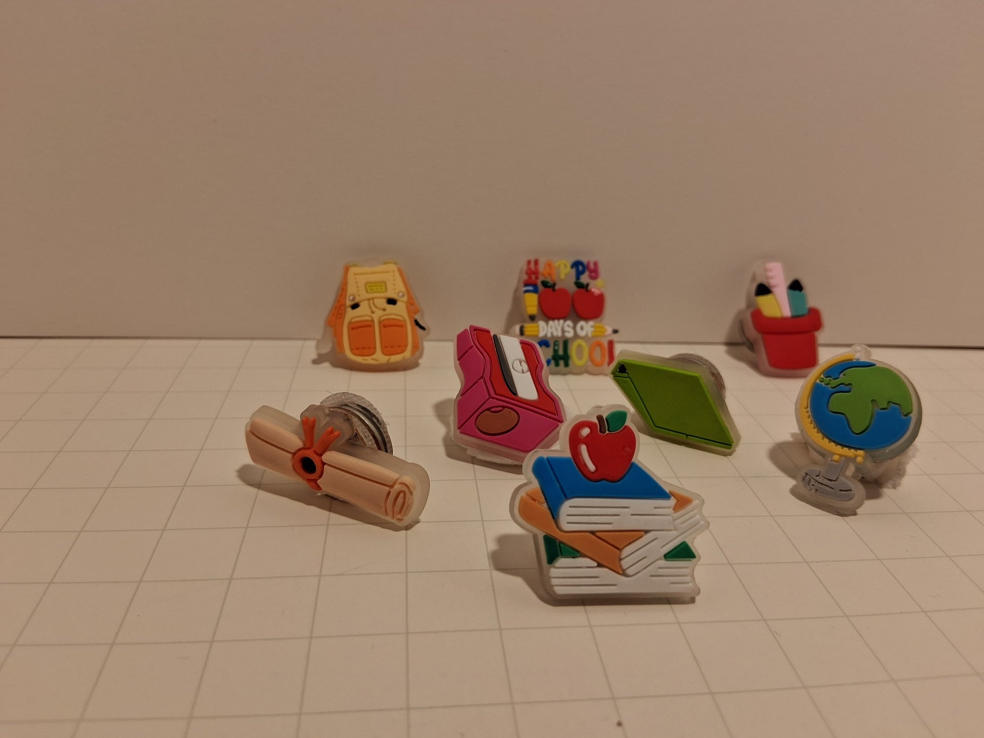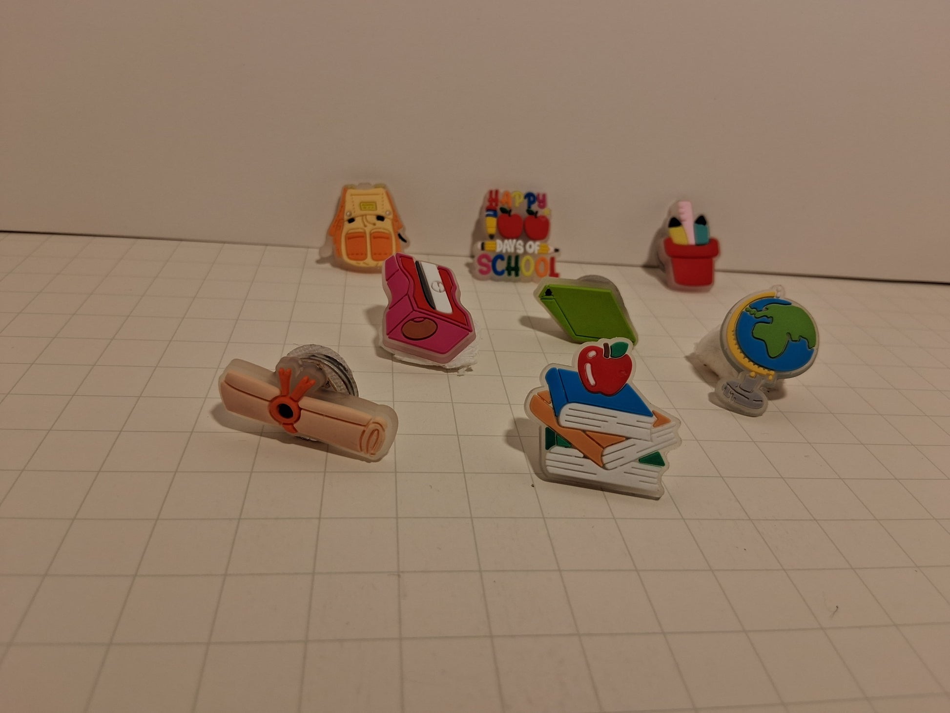 - Set of 8 unique designs: Includes playful school-themed shapes like a pencil, notebook with an apple, world globe, diploma, and more — all with bright, colorful designs.
